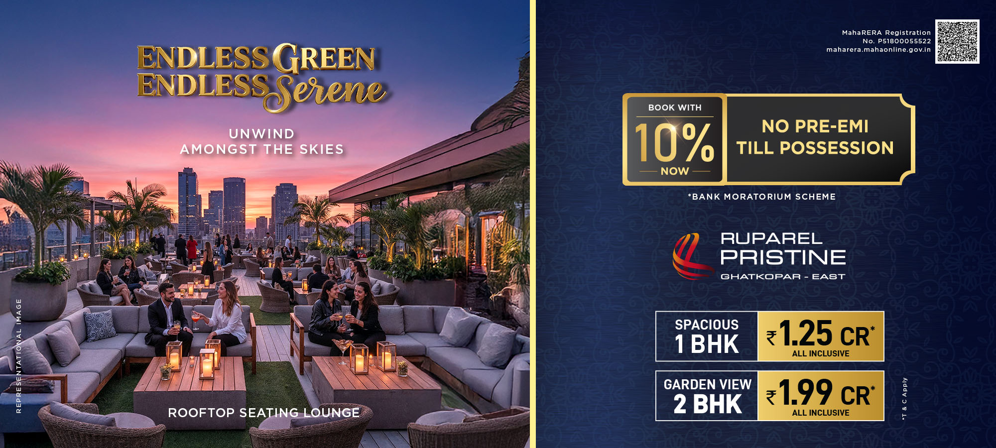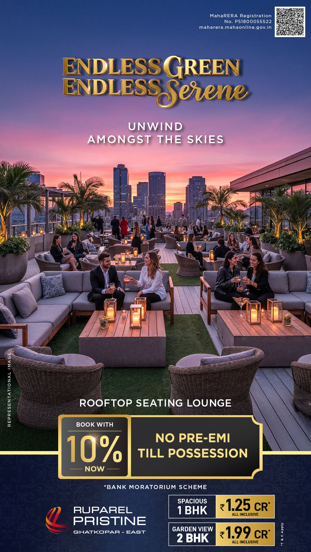 Disclosure: MahaRERA Registration No. P51800055522 | www.maharera.mahaonline.gov.in Disclaimer: The information and material contained in this brochure pertain to the real estate project “Ruparel Pristine(“said Project”) registered with Maharashtra Real Estate Regulatory Authority under Registration No. P51800055522 and is available on the website – www.maharera.mahaonline.gov.in The photographs, images, plans, drawings, sketches, renderings, pictorial and graphical representations, specifications, illustrations, other information etc. contained in the brochure are typical stock/standard photography used by the industry at large and/or pure imagination, and are intended to indicate a conceptual and aspirational lifestyle. None of the aforementioned are indicative of how the Project or any part thereof looks at present and/or may eventually look in future and/or may be designed, constructed and/or completed. Fixtures and furnishings shown are only for indicative purpose and shall not be provided in the apartment. The views, landscape, aerial shots contained in this brochure or any other sales material are also from typical stock/standard photography. The information and material contained in this brochure are intended to supplement the information available on the website of MahaRERA and is not intended to be a substitute thereto. Any person who is considering/evaluating any apartment in any of the registered real estate projects in the Project, are required to independently analyse, acquaint and familiarise themselves with the information and disclosures pertaining to the Project as uploaded on the website of MahaRERA. In the event of any conflict (whether actual or perceived) between the information and material contained in this brochure and the details of the Project available on the website of MahaRERA, the details as available on the website of MahaRERA shall prevail. The buildings and projects appearing in the images of Brochure and constructed in the vicinity of the Project are constructed by various other persons who are not connected with the Developer. These images are included so that any person gets a fair idea of the landscape in and around the general macro-region of the Project. Any person considering/evaluating any apartment in the Project, should visit the site and land of the Project and ascertain the layout, views, landscape and other aspects as he/she/it/they may deem important or required. Any such person must also evaluate and examine all information required to be disclosed under law. The Developer expressly reserves the right to make modifications, revisions, amendments, relocations substitutions and/or withdrawals with respect to any facet or component of the Project, including as depicted in any information or material contained in this brochure, in the manner it may deem fit. The Developer expressly clarifies and makes it abundantly clear that the finalised details, specifications and particulars with respect to any facet or component of the Project (including as depicted or stated in this brochure) shall be as indicated in the registered agreement for sale that may be executed by the Developer and as disclosed by the Developer, and not otherwise. These printed material does not constitute an offer and / or contract of any type between the Developer and the recipient. Any purchaser of this development shall be governed by the terms and conditions of the agreement for sale entered into between the parties and no details mentioned in these printed material shall in any way govern such transaction.